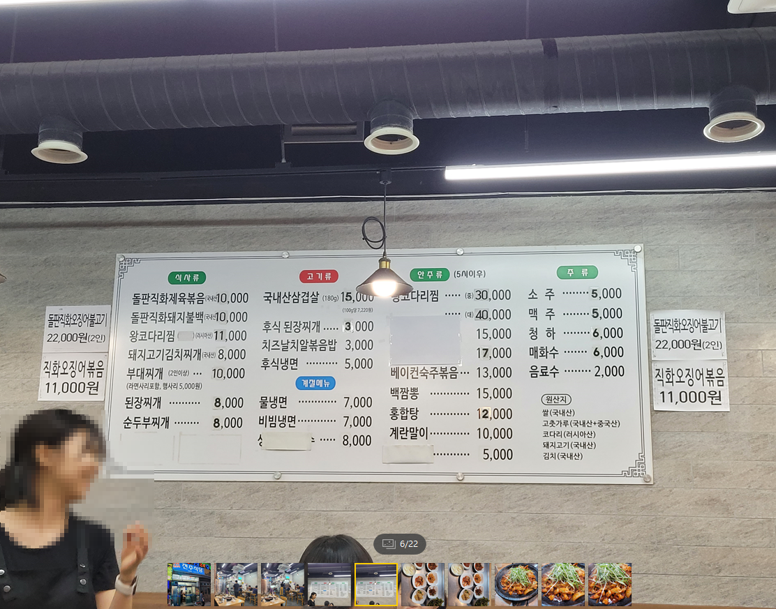 메뉴판은 벽에 시원하게 붙어 있는데 저희는 돌판직화오징어불고기 2인, 순두부찌개를 시켰습니다.